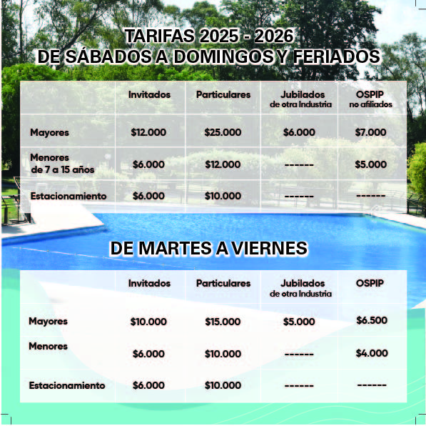 - Centro Recreativo Alberto Oscar Murúa: el afiliado puede ingresar de Lunes a Domingos con 4 invitados abonando la tarifa correspondiente.